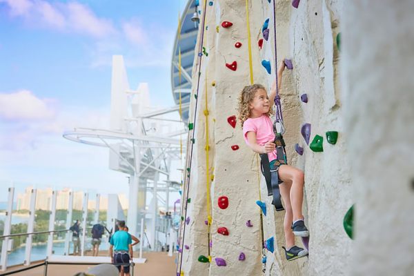 Harness your courage and gear up for a vertical scramble to the summit of Adrenaline Peak —the ultimate rock climbing expedition and highest vantage point yet. Located at Thrill Island, this craggy course rewards your skills with unmatchable views from the top of the ship.